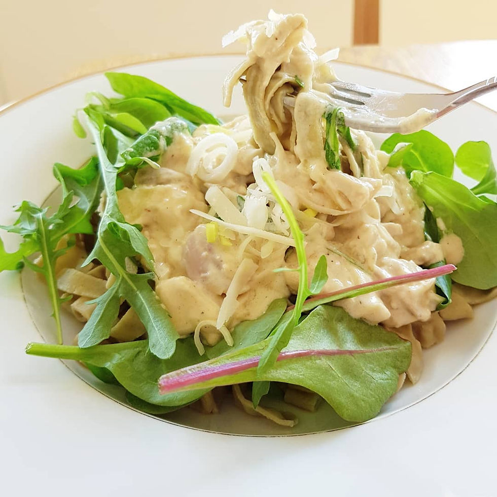 Hacka löken och stek i lite smör. Häll på grädden och vänd i créme Fraiche. Smaksätt med fond och ha i valfritt innehåll (svamp, kyckling, bacon, broccoli).
